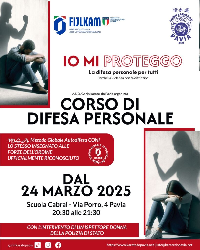 Corso di difesa personale tenuto dalla cintura nera Fabio Zoppetti e da Massimiliano Piana dell’ASD del Gorin Karate-do Pavia. Il corso di difesa personale segue il metodo riconosciuto dal CONI: MGA (Metodo Globale Autodifesa) insegnato anche alle forze dell’ordine disponibile a Pavia c/o la palestra della scuola Cabral in via Porro, 4 – dalle 20:30 alle 21:30.